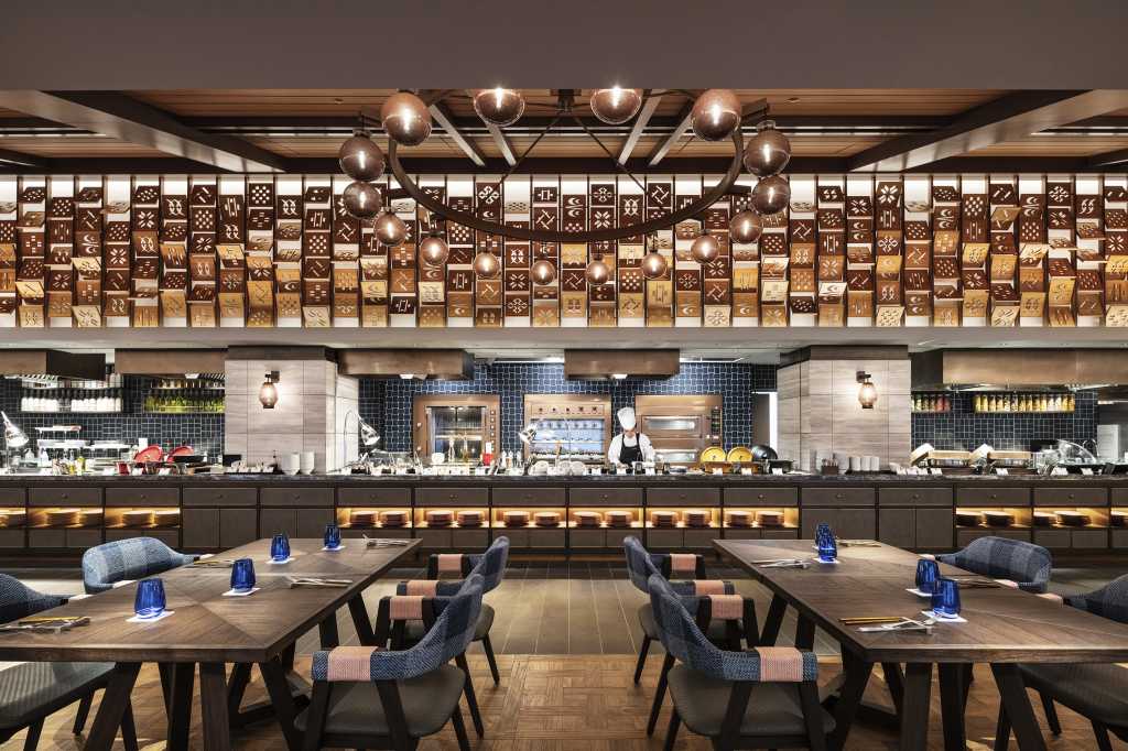 Ishigaki Bold Kitchen, located in Fusaki Beach Resort, is an international-style restaurant serving a full range of breakfast, lunch and dinner options. Here, one can discover delicious and exciting flavors from around the world. The 350 tsubo (1 tsubo = roughly 3.3 m2) interior is divided largely into two areas, the dining area and the lounge area. In the main dining area, furniture has been arranged to surround the show kitchen so that diners can enjoy viewing the live performance of each section of the kitchen from close by. The layout also enables kitchen staff to perform energetically night and day. Wooden feature screens inspired by Minsah weaving, native to Ishigakijima Island, are placed at random angles above the show kitchen and over windows. Not only do the screens impress the viewer with their design, but they also convey a sense of freedom only felt at resorts and an overpowering sense of scale. (Taiji Fujimoto / DESIGN STUDIO CROW)