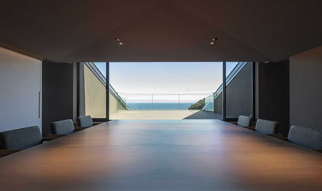 「SOKI」は、素(す)の器(うつわ)に由来し、手を加えすぎない美しさや経年変化を楽しむことができる、土地の自然や風土「素」材を嗜む「器」としての宿を目指している。建築の全体構成としてレセプション棟と客室棟、レストラン棟を分棟配置し、それぞれの空間の境界を明確化させた。トネリコがインテリアデザインを担当したレセプション棟と客室棟は、「素空間」をコンセプトに、天然素材にこだわり、シンプルながらも温もりを感じられる心地良い空間となっている。各所にアクセントとして自然顔料を用いたアート和紙を配し、非日常感を演出した。レストランはエイジがインテリアデザインを手掛け、ダイナミックな建築のスケール感を最大限に生かした食に対する高揚感を高める空間に仕上げられている。約4.5mの天井高や外光を取り込んだ開放的な空間の中央に炉を構え、目の前で料理が出来上がる臨場感を体験できるよう設えた。(UDS)