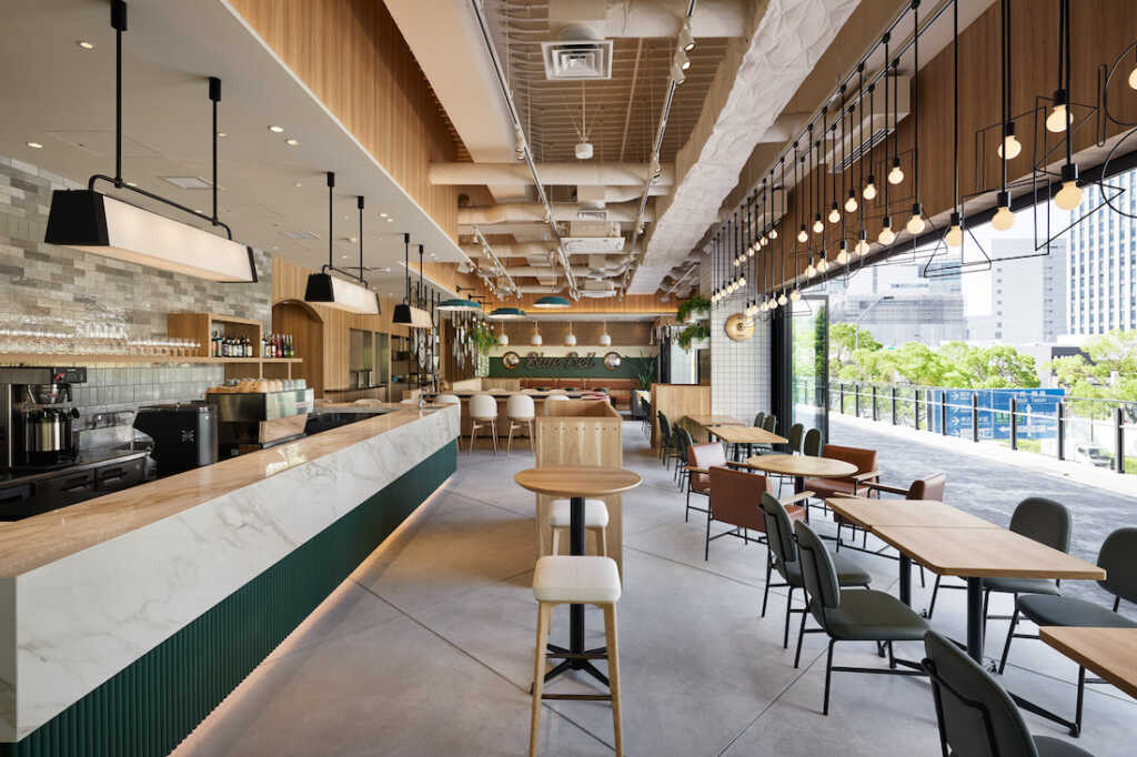 オールデイカフェダイニング「The Blue Bell」は、この施設で唯一、メインイベント利用者以外もご利用いただけるエリア。そのため、カジュアルで日常使いしやすい世界観を大切にし、植栽もインテリアに取り込んだ心地よい空間を目指した。その中でも、各所に音楽を感じる素材やデザインをさりげなく散りばめ、それに気づいたときの楽しさが繰り返すようなこの施設らしい仕掛けも備えさせた。