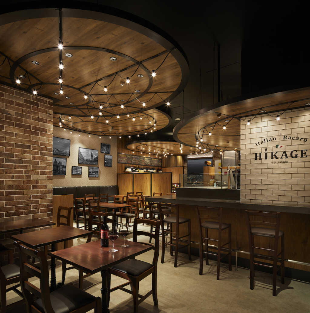 2020年9月、竹芝に開業したスマートビル「東京ポートシティ竹芝」の2階に「イタリア酒場 HIKAGE」がオープンした。竹芝は豊かな水辺が広がる地域だ。昔、水の都ベネチアでは、バーカロと呼ばれる屋台がワインの劣化を防ぐために日陰の下を移動しながら商売をしていた。低く囲われた木陰に人々は自然と集まり、賑わいを楽しんだ。樹木に囲われた空間はオープンでありながら室内にいるような安心感を覚える。そんな普遍的な人間の感覚に思いを巡らせ、バーカロを現代の水辺に甦らせた。内と外の境界が曖昧に連続する木陰、ファジーなアウトラインの連続をこの店舗ではデザインしている。(笠原英里子/カサハラデザインワーク)