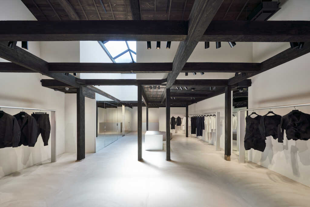 古都の町屋に誕生する未来的な空間。「A-POC」の衣服が生み出されるプロセスをイメージした空間は、特殊な技術で一体成型されたアルミニウムの什器によって構成されている。テクノロジーと手仕事を融合させるイッセイミヤケのものづくりのように、この空間には歴史と未来のコントラストが表現されている。(吉岡徳仁