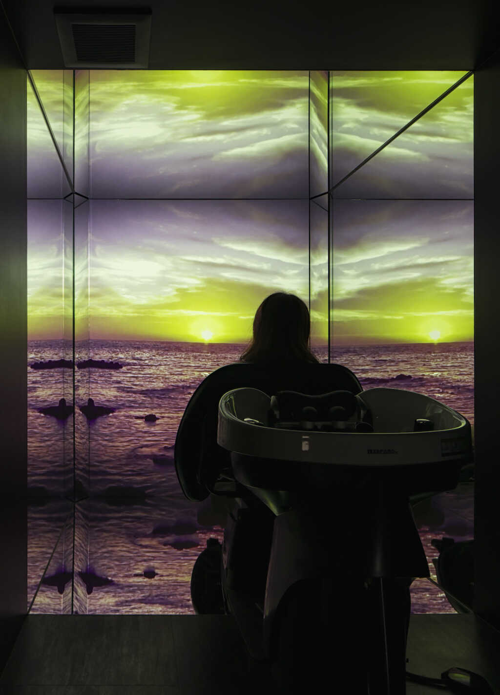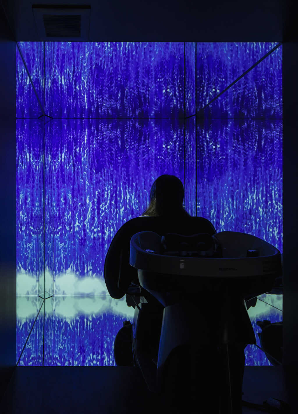 美容室の支店出店プロジェクト。既存店とは異なりエステの導入やシャンプーを個室化する事から、五感に訴えるような空間体験を提供をしたいとの要望があった。クライアントからの「自然」「変化」といったキーワードをもとに、光や映像を用いて空間を構成。フロアはフェイクの壁面緑化に対し、変色できるライティングでその時々で四季を表現。シャンプーブースはプロジェクターの映像をミラーで上下左右に拡張する事で、ゲストを瞬時に別世界へと誘う。エステルームは水をイメージした動きのあるライティングで深海にいるような演出とした。最高の施術によるリラクゼーションと連携した空間体験を目指した。(小林昌平/タカラスペースデザイン)