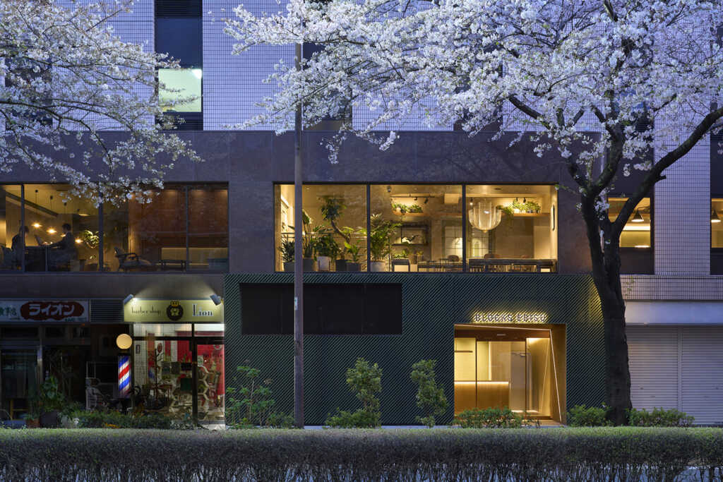 既存建物は、明治通り沿いの桜並木に面し、裏側に渋谷川が流れる。40mを超える幅広い通りに対して、両端の歩道それぞれで印象的な風景があり、そこにブランドを感じさせるファサードをデザインした。内装は、不動前からのブランドイメージを踏襲しつつ、2階のラウンジ1は、渋谷川の掘り込みを反転させるイメージで天井に環状の棚を設け、ワークスペースを確保しながらブランドコンセプトの1つである植栽を多く取り入れる工夫をしている。2階には、他に会議室や1〜2名用の個室オフィス、雰囲気の異なる小さめのラウンジも用意されている。3〜9階は、元から小さなオフィスとして利用されているため大きな区画変更はせず、共用部であった給湯、コピー室などを整理して、新たにWEBブースを追加した。