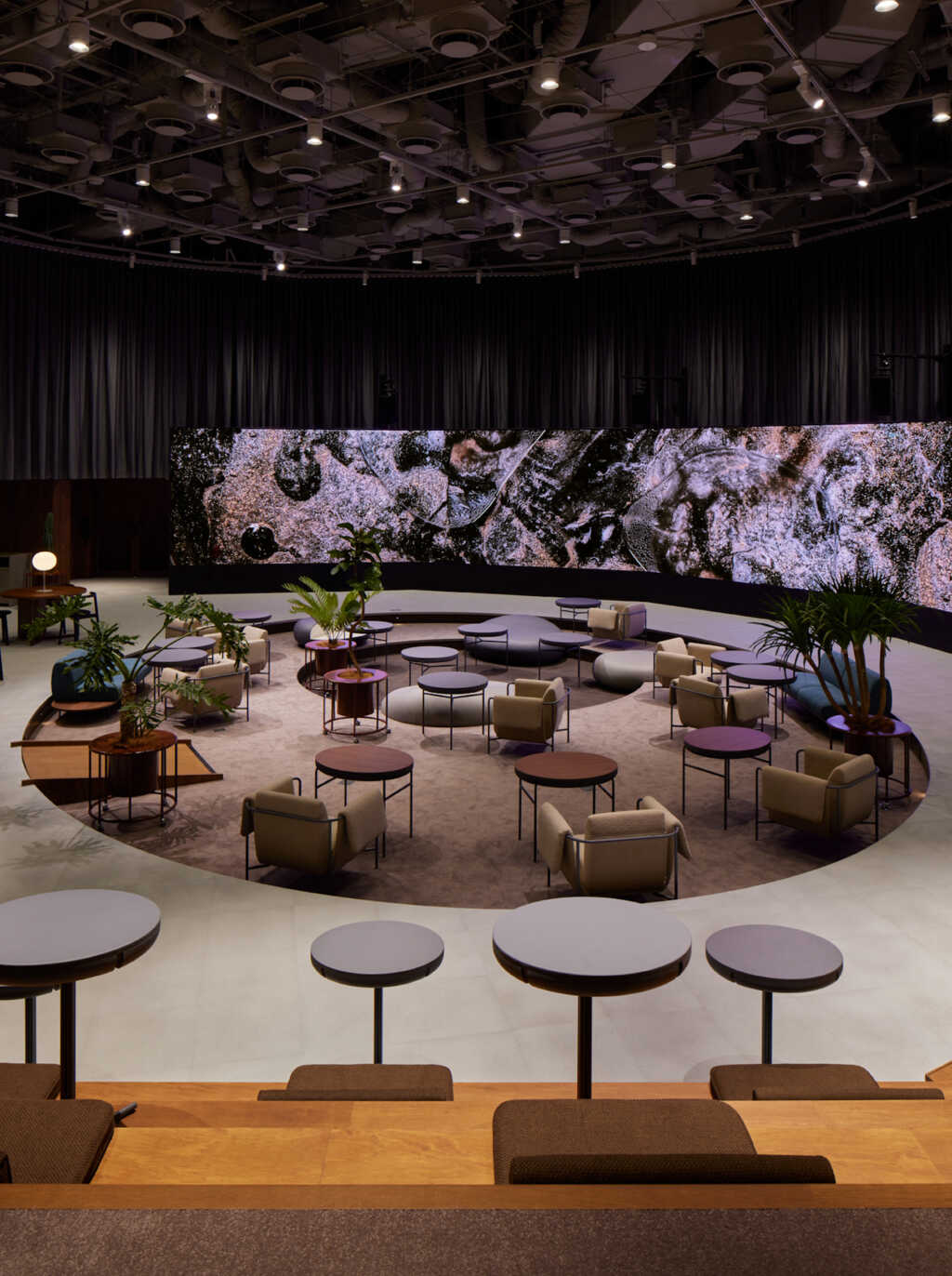 「THE CAMPUS HALL “CORE”」は、これから生まれるヨコクの発信拠点として、THE CAMPUSから生まれるエネルギーを世の中に広げ、新しい情報発信と共感を生み出すオープンコミュニケーションホールとなることを期待した。ステージと客席という旧来型のホールを再考し、方向性を問わないすり鉢状の空間形状と大型LEDビジョンなどのデジタルテクノロジーを導入することで、多様で自由度の高い集い方を可能にしている。(原田 怜/コクヨ)