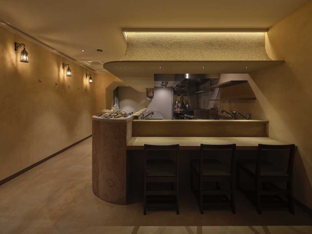 スパイスの魔法に包まれる、地下カレー。「西成クミン」は、和食とフレンチ出身の二人のシェフによるスパイスカレー店です。大阪の歓楽街・日本橋に構える店は、静けさと開放感が融合したような約47㎡の地下にあり、階段を降って二重のアーチを抜けると、エキゾチックな空気が漂う空間が広がります。内装は、吹き付けの壁やアールを用いて、従来のカレー屋のイメージを一新するようなディテールを表現することで、スパイスを重ねるように時間と共に彩りや香りが増していく食空間を目指しました。(酒谷充紀/OVALL)