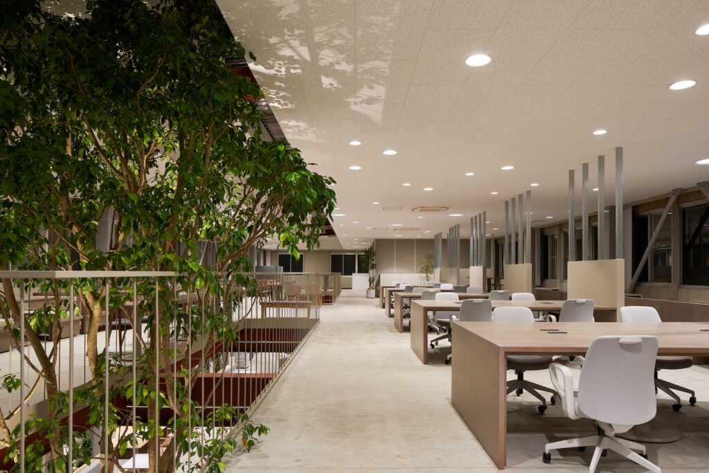 建築へのアプローチは公園として、地上から建築改修し、5mのカンチレバーとなった庇上まで植栽が立体的に広がり地域に開かれる。入り口では先端技術を使ったコンクリートの3Dプリンターと紅葉がコラボしたオブジェが出迎える。内部に入ると高さ7mを超えるベンジャミンのシンボルツリーがそびえ、外の植栽を力強く屋内に引き込み、まるで外にいるような気持ち良さで働ける。東西に流れる吉野川VALLEYのトップライトからは自然光が注ぎ、昼間は自然光のみで働き、夜は星空のような照明のもとで過ごす。また東西に自然の風がそよぐため、中間期は空調なしの通風のみで十分快適に過ごせる。インテリアは、既存建築のマテリアルと新たな素材を等価で扱い、かつ境界をなくしている。例えば、既存の仕上げを剥ぐことで現れたタイル跡の残る床、赤い錆止め塗装の天井の素材感を融合し、壁はシンプルな合板であわせた。このオフィスではActive Based Workingを実践し、なかでも家族と共に働けることが特徴の一つで、旧来の働き方を脱ぎ、社員・家族・地域を巻き込んだ新たな働き方を目指している。吉野川VALLEYのもと、北岡組の文化と産業の次の流れを関係者とともに生み出すきっかけがここに完成した。(佐藤 航/WATARU ARCHITECTS)