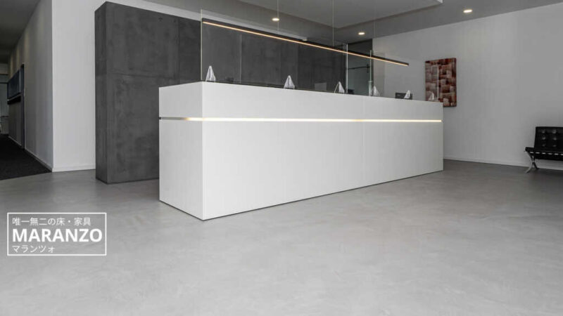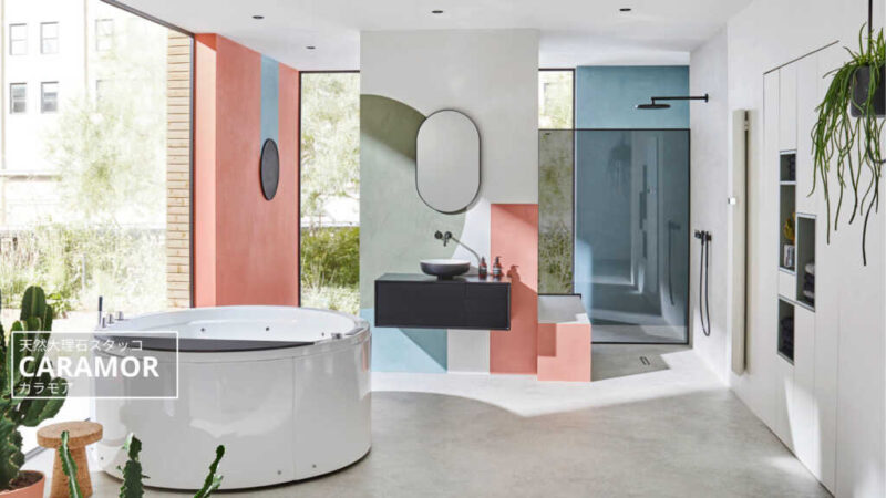 「フレスカラリ」は、天然大理石と消石灰をベースに、96%以上を自然原料で構成したドイツ製の意匠仕上材。従来の左官材では難しかった鮮やかな発色を実現し、さらに調湿性や消臭効果も備える。濃色を含む幅広いカラーバリエーションによって、壁面だけでなく、天井や床、什器に至るまで、高耐久かつ高防水の仕上げをできるのが特徴。