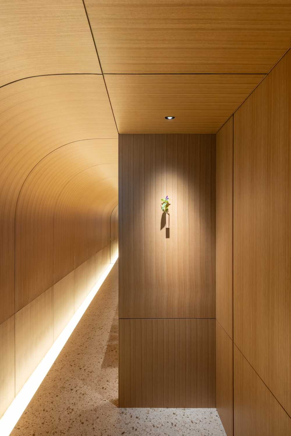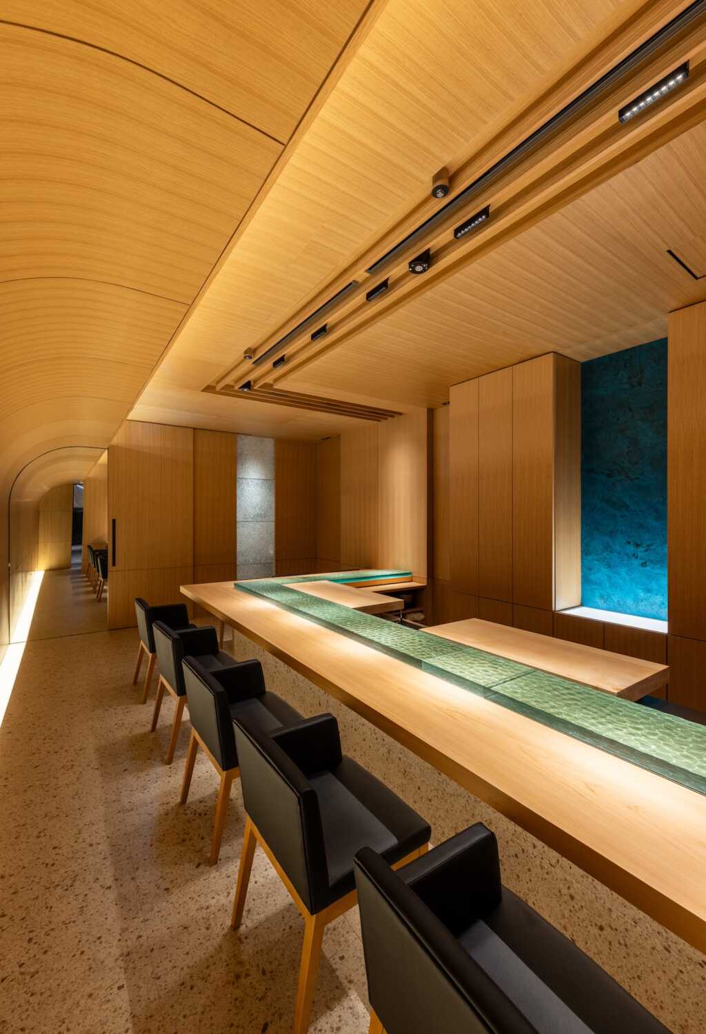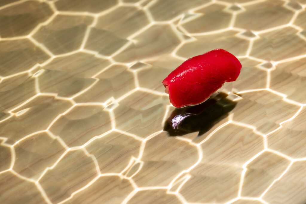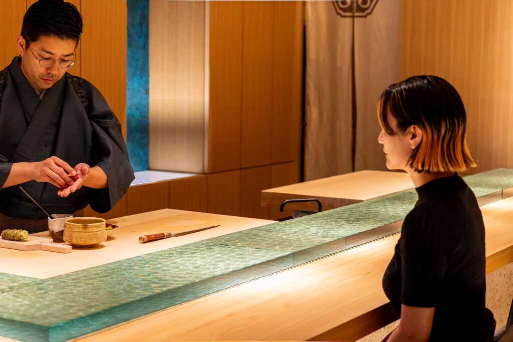 昔ながらのオーセンティックなお寿司屋さんは、檜の付台に直接寿司を提供するが、ここでは水の流れを模したガラス製の付台に寿司を提供する。水面の光がキラキラと揺れる水底に寿司の影が映り、寿司が小川を泳いでいるように見える。お客様は寿司の写真を撮らずにはいられない。その写真をお客様がSNSにアップすることで、お店の情報が拡散され、お客様がまたお客様を呼ぶ。(松本哲哉/KTXアーキラボ