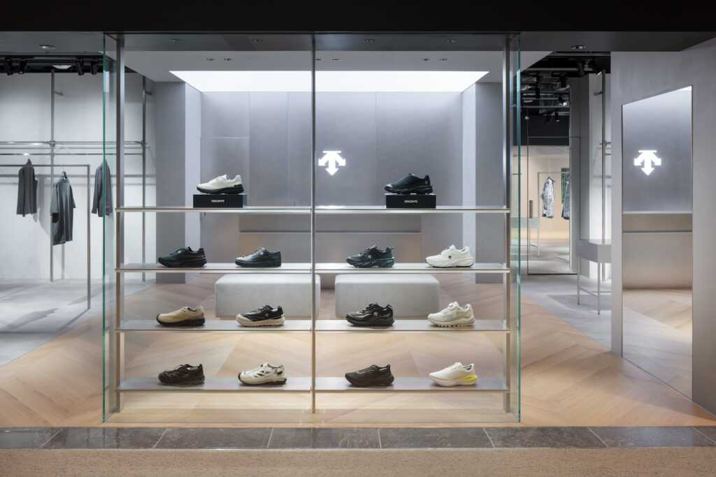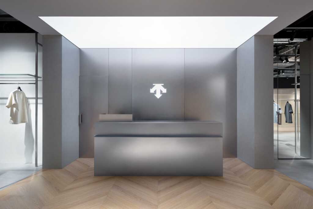 スキーウェアへの挑戦からスタートしたDESCENTE。そこから生まれた多様な製品を取り扱う店舗として、東京駅近くに位置する新丸ビル店のインテリアデザインを担当した。DESCENTEが最も大切にする哲学「機能美」を表現するため、ステンレス、面発光、ガラスなどの素材を中心に構成。また、3つの矢印からなるスピリットマークからヒントを得て、店舗を特徴づける素材として「45度」傾斜した左官材の櫛引やヘリンボーン貼りの床を各所に採用した。ブランドロゴであるスピリットマークはスキーの基本技術である「直滑降」「斜滑降」「横滑り」を意味するものであり、ブランドの果敢で積極的な姿勢を表現している。斜めに櫛引した左官材は、「圧雪したてのゲレンデ」を連想する仕上げとなった。