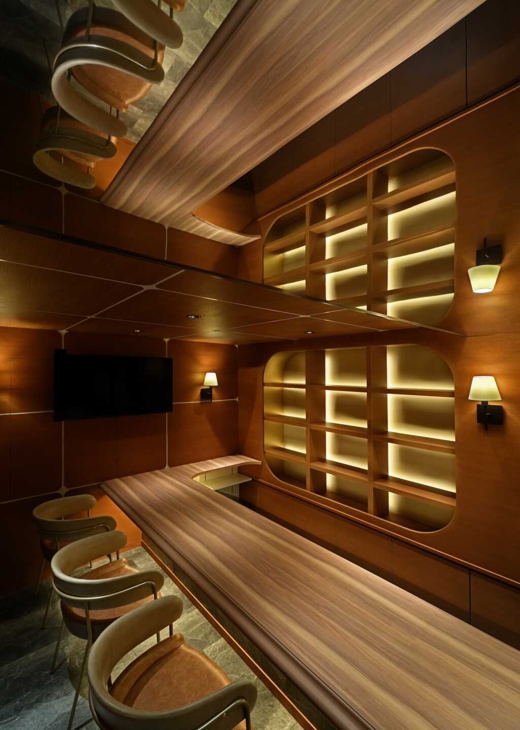 「昭和フューチャー 〜あの時見た未来から」。1970年、大阪万博。高度経済成長の真っ只中、日本中が「未来」に心を躍らせていた時代。まだ誰も見たことのない世界が、万博のパビリオンによって具現化され、人々は初めて「未来の形」を目の当たりにした。大胆でサイケデリックな流線型のアールデザインや未来的建築物、そんな“昭和が夢見た未来”=昭和フューチャーがそこにはあった。昭和ノスタルジックでレトロという表現ではなく、あの時、あの時代に人々が夢見た未来の形を現代のスナックというコミュニティ空間に思想移植し再構築しようと考えたのだ。あの時代、あの当時昭和の人々が夢見た最先端デザインをこの場に表現できたら面白いのではないかと考えた。若い人には新しく、ミドル、シニア層には懐かしい感覚(純喫茶的感覚)も思い起こさせる空間をデザインした。(スーパーマニアック)