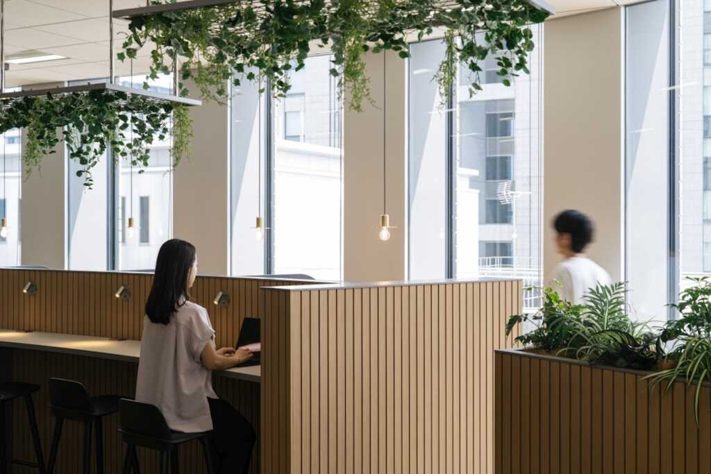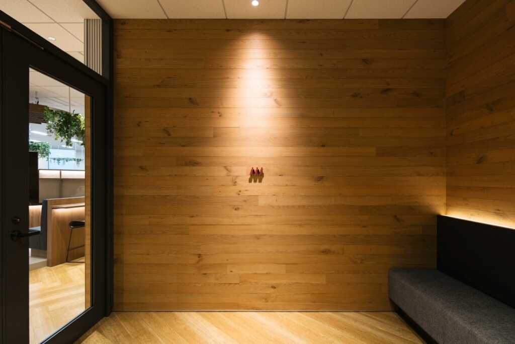 大阪に本社を構える不動産会社の新オフィスである。現在17名のスタッフ数から、数年をかけて約30名規模へと拡大していくことを見据えた移転計画であった。移転前のオフィスでは、全員が固定席で執務を行っていたが、営業部門の社員は外出が多く固定席の稼働率が低かった。また、オフィス内で昼食をとる、休憩する、子供を連れてくる、社内のカジュアルなミーティングを行うといった執務以外のための空間の必要性があがっていた。そのため本計画では、単なる執務機能にとどまらない、多様な過ごし方を受け入れる豊かな空間が求められた。