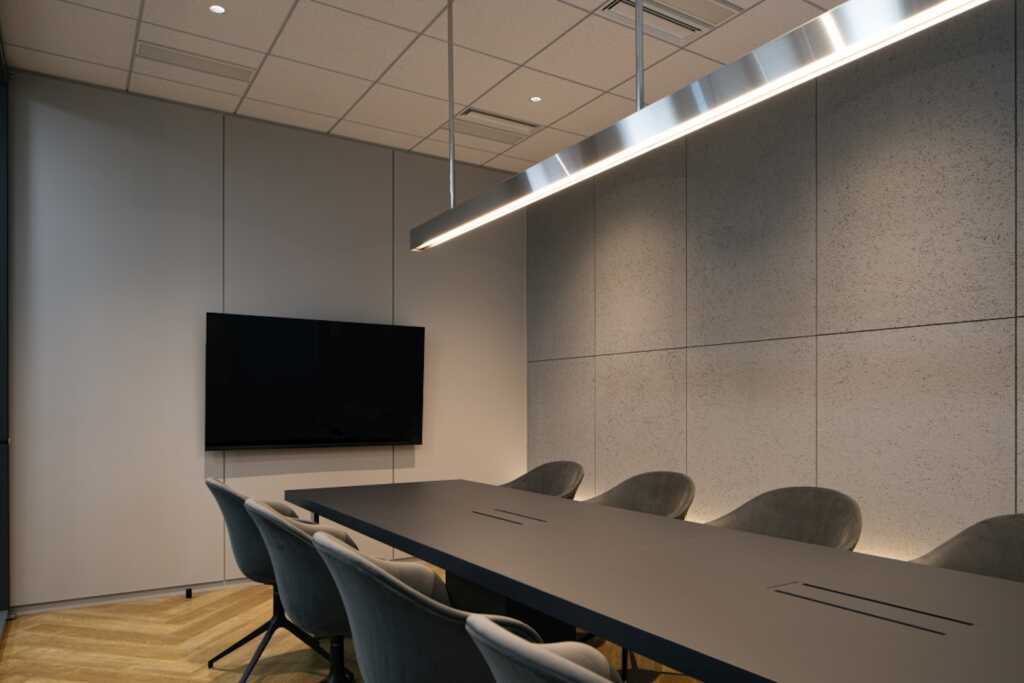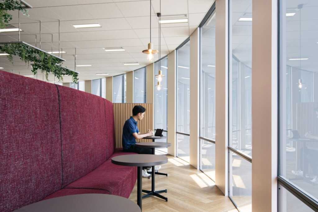 計画地は中之島フェスティバルタワーの18階、南東角に位置する約300㎡の区画である。南東向きに開けた眺望、外壁のR形状、そして午前中から昼過ぎにかけて柔らかく移ろう日差し。この区画が持つ特徴を最大限に生かしたオフィスをつくれないかと考えた。平面計画は、外壁のR形状をオフセットするように円弧状に広がる構成とした。円弧の中心から、来客用のラウンジ、個人デスク、ハイカウンター席と対面テーブル席、ソファや小上がりが連続する窓際と、放射状の層を描くように執務エリアをゾーニングし、その両側には来客用の会議室エリアと従業員用のバックオフィスエリアを配置した。執務エリアには、固定席としてスタッフの増加に柔軟に対応できる仕切り板のないシームレスな円弧状のデスクを設けた。さらに、スタンディングカウンタ―、ハイカウンター席、対面テーブル席など、多種多様な執務場所を配置し、それぞれのワークスタイルに合わせて執務場所を選べるようにしている。窓際には、複数人でも使用できるオープンソファ、仕切り壁のある集中ソファ、靴を脱いでくつろげる小上がりを設けたリラックススペースの性質の異なる3種の空間を設け、働き方や休み方をスタッフ自ら選んで過ごすことができる空間とした。列柱のように連なる柱型には、3種類の空間のカラースキームに対応した柔らかなグラデーション塗装を施し、性質の異なる空間同士に緩やかな繋がりを生みだしている。