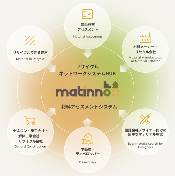 「matinno」とは、建築資材のライフサイクル全体を俯瞰し、素材の環境評価・検索・マッチング・プロジェクト管理を一気通貫で支援するSaaSプラットフォーム(インターネット経由で利用できるクラウド型ソフトウェア基盤)。建築家や設計者、施工者、素材メーカーなどをつなぎ、環境評価・検索・再利用管理を一体化。循環型で透明性の高い素材活用の実現を目指すという。