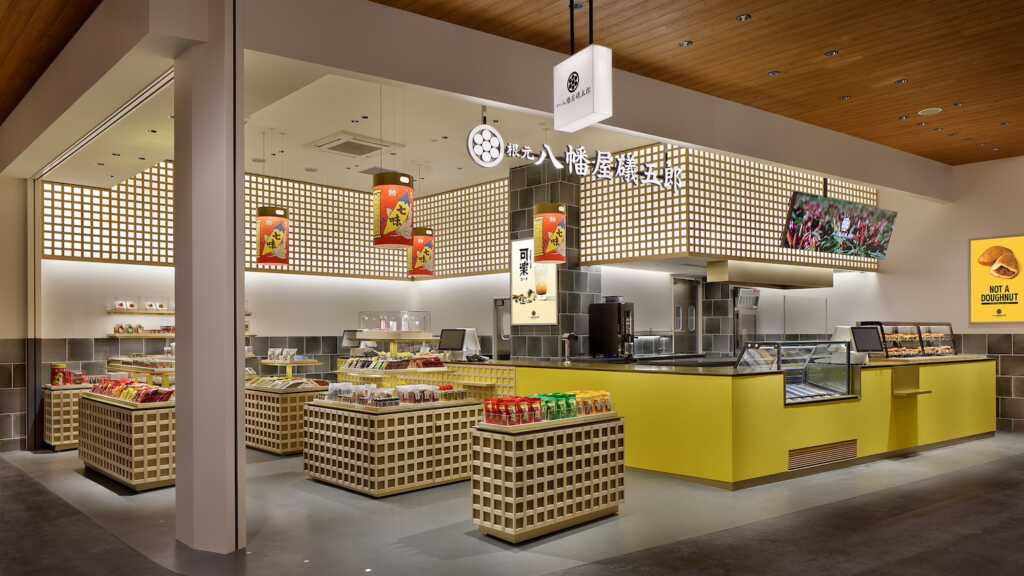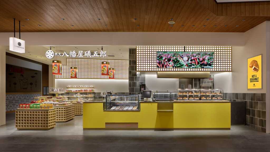 木と紙と土、自然素材を用いた手技の集積と現代のテクノロジーで「風土」を表現した「根元 八幡屋礒五郎本店」のデザイン。この店舗では、憧れの本店の雰囲気をもとにしながら、その延長線上にある日常的でカジュアルな環境を、「素材=スパイスの再編集・再構築による新商品/カレーパン」をテーマに、カレーを印象付けるターメリック色の左官で表現しました。(辻村久信デザイン事務所+ムーンバランス
