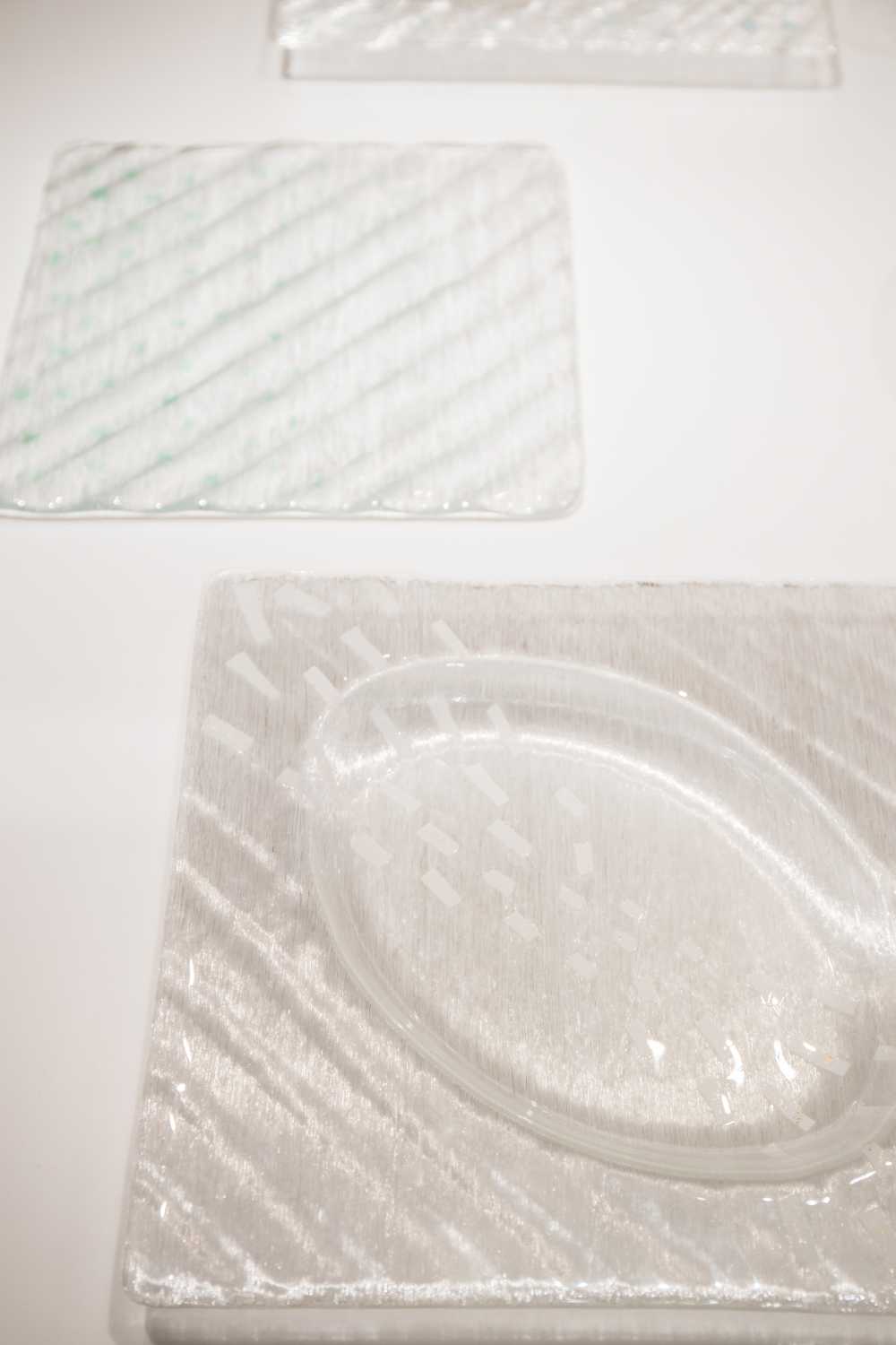作家の森康一朗氏は、「吹きガラスによる器や花器をつくる機会が多く、今回は展覧会なので、そこにパッと目にした時のインパクトのあるものを作りたいと考えました。ケーンワークという、色の付いたガラスの棒を、透明のガラスに巻き込みながら色のラインをつけていく手法を用いています」と話す。また、透明のシンプルな器でありながら、形状や端々に独特の形状を持たせた作品を展示した森知恵子氏は、「普段から、日常で使える器に私が作ったというオリジナリティー少しだけ取り入れたものを作りたいと考えていて、皿やコップなど、同じシリーズで用途のバリエーションを用意しました。実際に、器に料理が盛られている写真を見て、料理研究家の方やカメラマンの方など、他者の視点を知ることができ、新たな刺激をいただくことができました」と語る。