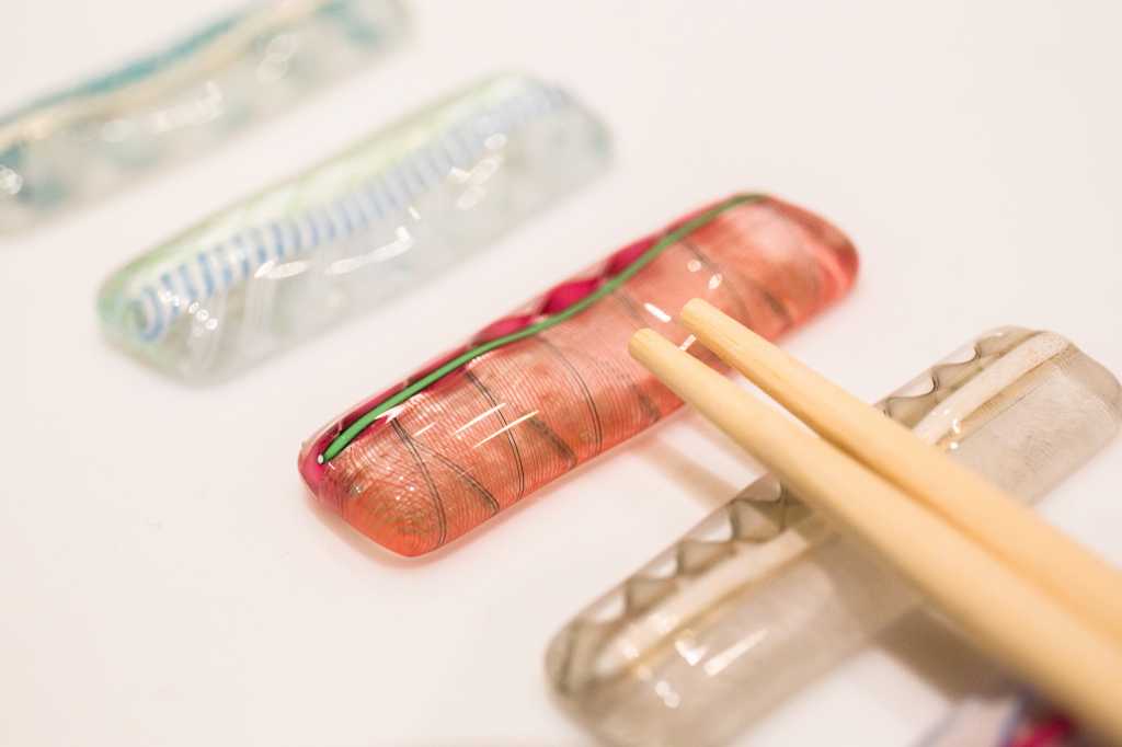 細いガラスの線材を積層させる手法が特徴的な吉田薫氏は、「私自身は器をつくる機会があまり多くないため、自分の作品に料理が盛られているの見て、さらにさまざまな状態も見てみたいという思いを強く持ちました。また一方で、料理や飲食業に携わっている方々が、自分の作品に何か創作上のヒントを感じ取ってもらえればと思っています」と話す。