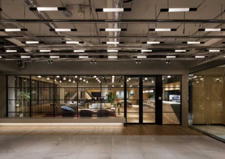 芸能事務所である「ワタナベエンターテインメント」が、表参道の地から原宿へ、動画スタジオや録音スタジオを備えた新社屋に移転。同社のコンテンツを通して活性化する仕掛けをデザインに取り込み、それらのコンテンツを通してメンバーの個性や才能が掛け合わさり、その力が最大化される場所として、五感を通して新しい知や事業、コンテンツが共創されるような空間構成とした。ラウンジでは、社内外を対象としたセミナーやイベントの開催、他部所とのコミュニケーションアップを目的とし、良質のエンターテインメントを発信し続ける為の空間を目指している。